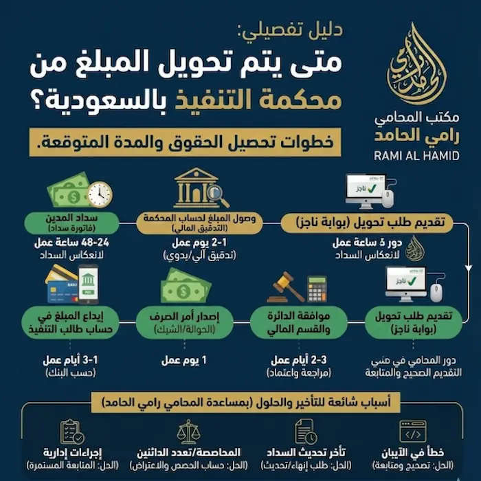 في هذا المقال التفصيلي، وبخبرة قانونية موثقة من مكتب المحامي رامي الحامد، سنشرح بالتفصيل الإجراءات، المدد الزمنية، أسباب التأخير، وكيفية ضمان وصول أموالك إلى حسابك البنكي بأسرع وقت ممكن.